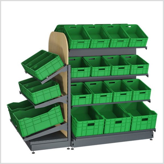 Fémpolcokra zöld műanyag dobozokat helyezhetünk el, amelyek lehetővé teszik a zöldségek és gyümölcsök csoportosítását.