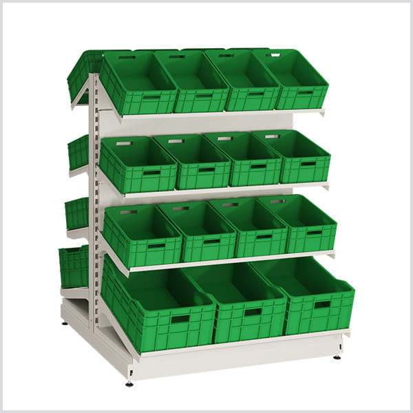 A gondola típusú fém zöldségpolcokat dobozos és doboz nélküli változatban is kínáljuk.