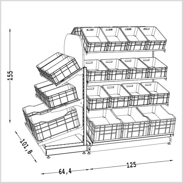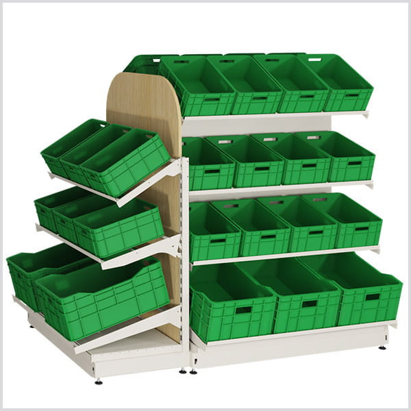 Fémpolcokra zöld műanyag dobozokat helyezhetünk el, amelyek lehetővé teszik a zöldségek és gyümölcsök csoportosítását.